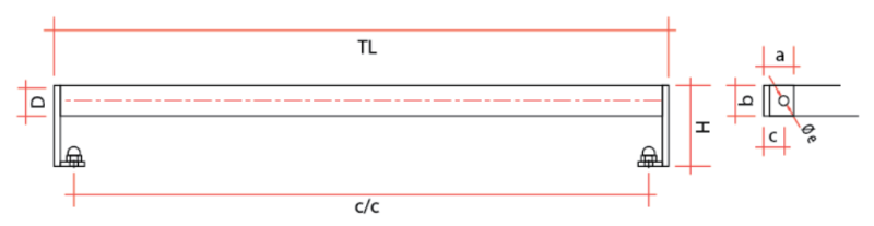 | Kods | D | H | c/c | TL | a | b | c | e |